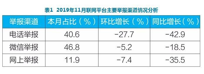 2019年11月联网平台主要举报渠道情况分析