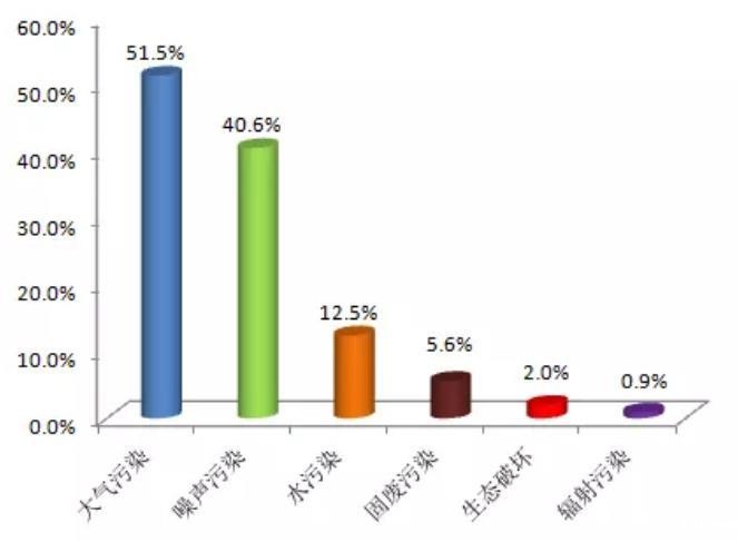 从污染类型来看,11月大气污染举报较多,占举报总量的51.5%,噪声污染、水污染、固废污染、生态破坏和辐射污染举报分别占40.6%、12.5%、5.6%、2.0%和0.9%。