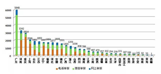 从各地区不同渠道举报数量看,广东、河南、重庆等地举报量居前,重庆、河南、上海等地电话举报占比较高,广东、江苏、广西等地微信举报占比较高。