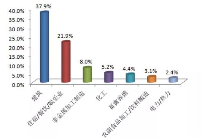 从行业类型来看,11月公众反映***集中的行业是建筑业,占37.9%,其次为住宿餐饮娱乐业和非金属加工制造,分别占21.9%和8.0%。其中,建筑业占比环比下降约11个百分点,非金属加工制造业和化工业举报占比环比分别约上升2.1和1.4个百分点。此外,电力热力业占比排名攀升至第7名,超过垃圾处理业。